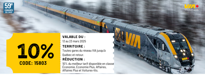 Voyagez avec VIA Rail Canada et profitez d’un rabais exclusif en saisissant le code promo : 15803 pour bénéficier de 10% de réduction du meilleur tarif disponible en classe Économie, Économie Plus, Affaires, Affaires Plus et Voitures-lits (sous réserve de certaines conditions et restrictions). Cette offre Via Rail Canada est valable du 13 au 23 mars. Prenez note que l'offre s'applique sur toutes les gares du réseau VIA jusqu’à Québec et retour.